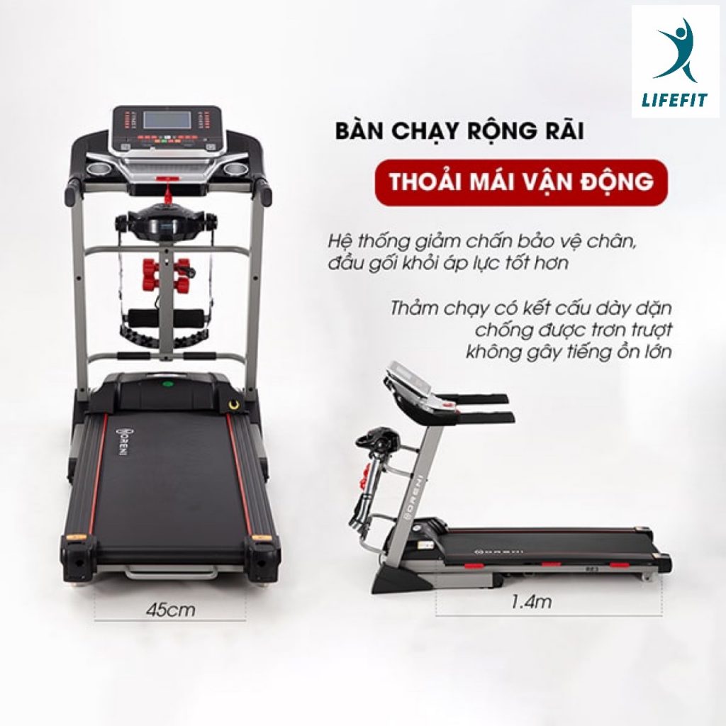Máy chạy bộ đa năng Oreni RE-3 sở hữu bàn chạy rộng 45cm cho bạn thoải mái thực hiện các thao tác vận động. Chiều dài 1,4m tự tin sải bước không sợ trượt vấp hay bước hụt ra bên ngoài. Bàn chạy có hệ thống giảm chấn nên máy bảo vệ chân, đầu gối khỏi áp lực tốt hơn. Đồng thời cũng đảm bảo yên tĩnh, cho không gian chạy bộ được tạo sự riêng tư.